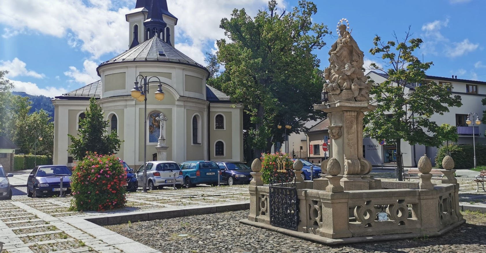 Náměstí ve Frýdlantu nad Ostravicí, v popředí sloup se sochou Panny Marie Kamelské v pozadí kostel sv. Bartoloměje. Foto Pavla Holomčíková